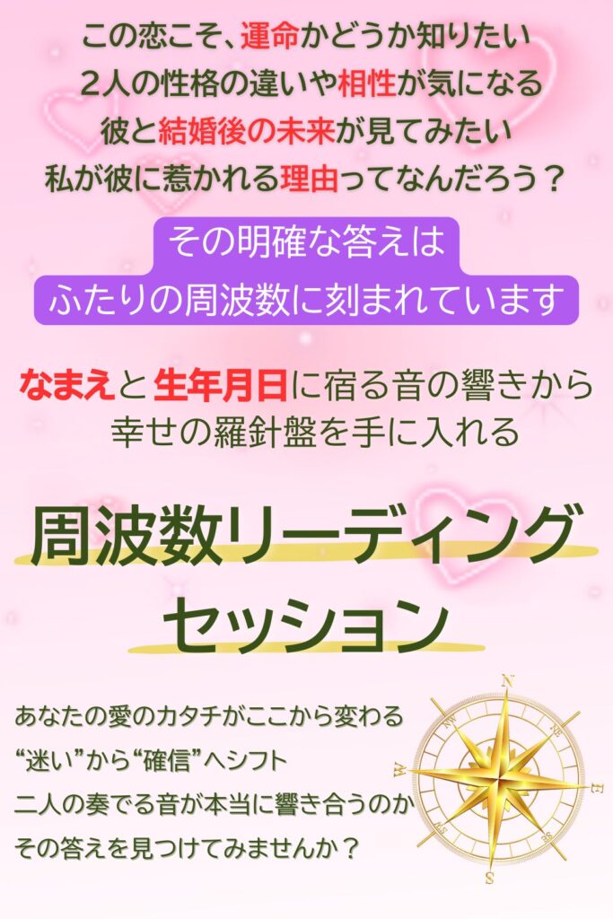 読み解いた“周波数”をもとに、しっかりお話を聞きながらお二人の羅針盤をお伝えします。